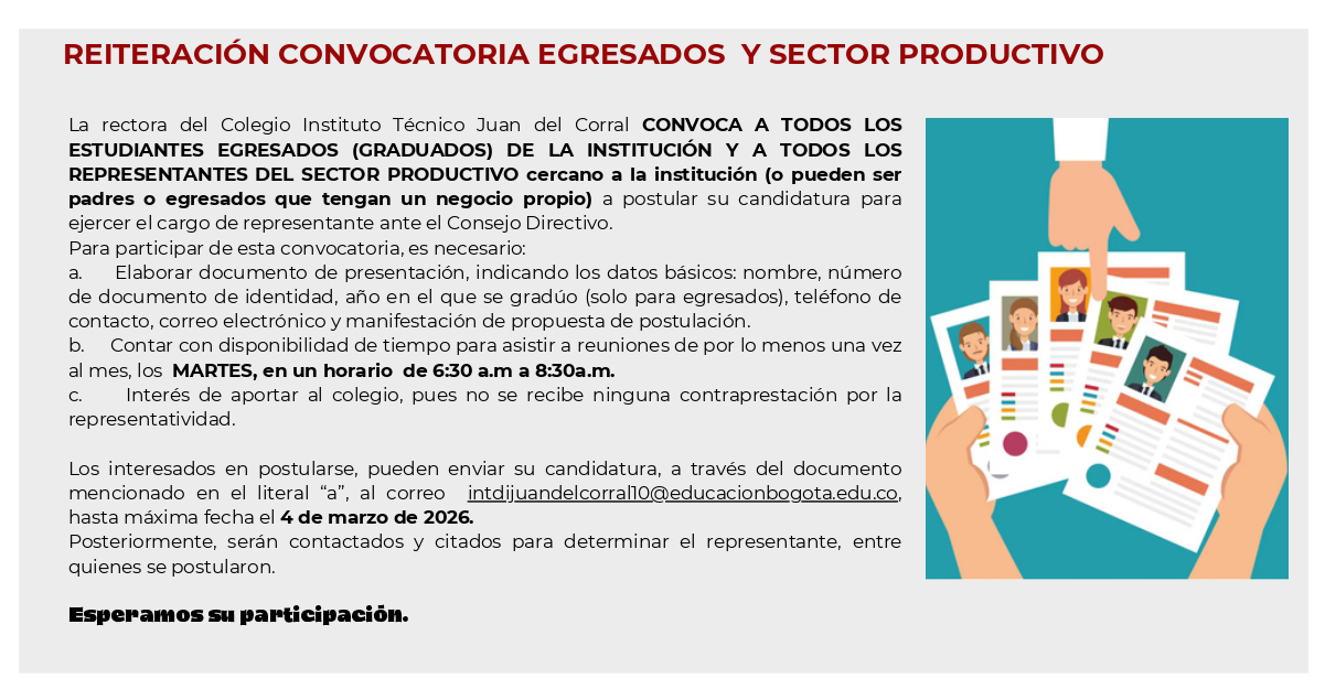 Convocamos a todas la personas interesadas para postularse como el representante de egresados y del sector productivo en el consejo directivo. El 23 de febrero